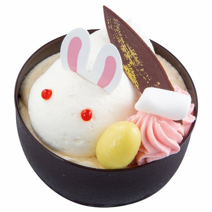 丸いカップに絞ったホイップクリーム入りカスタードクリームを、まんまるお月様に見立てています。中には、ホイップクリームと苺ソースで表現したうさぎや、餅に見立てたマシュマロ、杵に見立てたチョコレートで、お餅つきをしているうさぎをイメージしています。十五夜にぴったりなかわいらしいカップデザートですね。