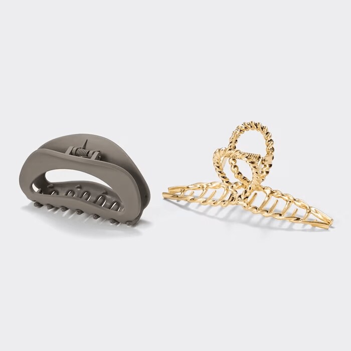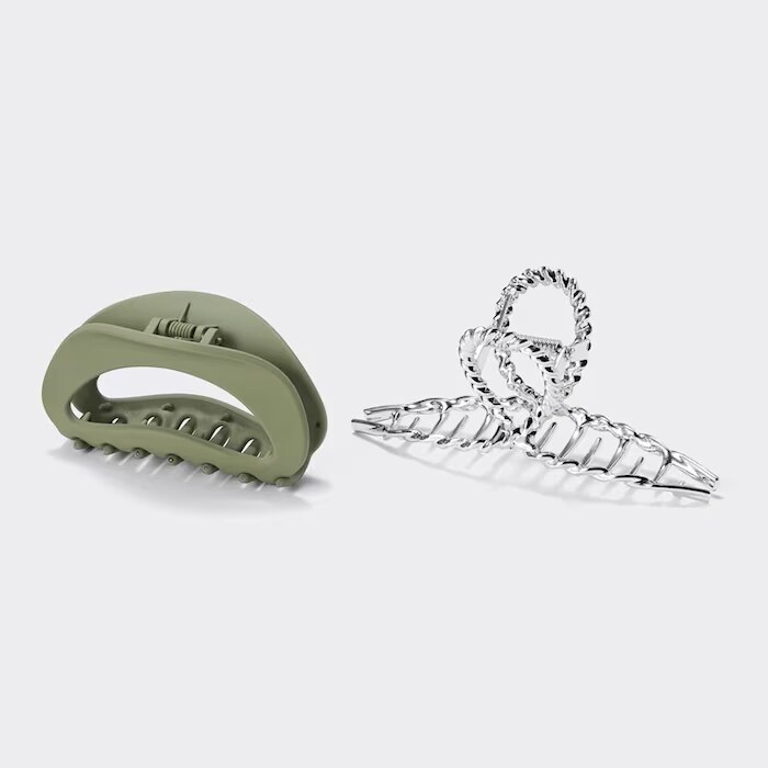大ぶりなデザインのヘアクリップ2個セットです。ツイストデザインのメタルバンズと、マットな質感のヘアクリップは、まとめ髪やハーフアップに便利。カラーは、ブラック・ダークブラウン・オリーブの3種類。