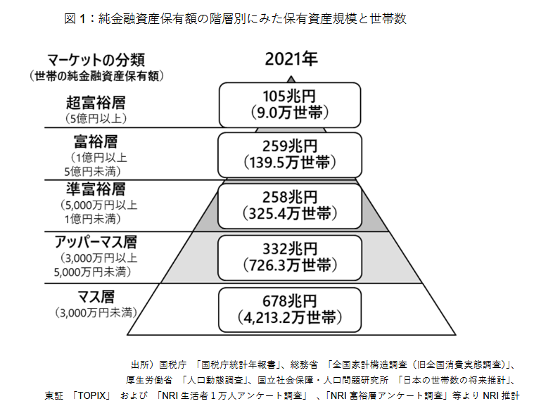 野村総合研究所では、この純金融資産保有額をベースに総世帯を5段階にランク付けしました。このうち富裕層とは、資産1億円超えと定義されています。