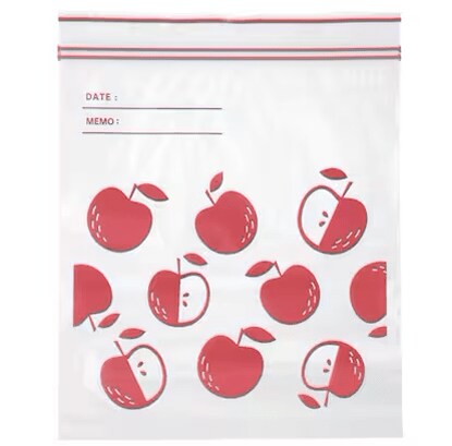 アップル柄のフリーザーバッグです。マチが無いので、カレーやサラダ、離乳食など、できるだけ薄くして保存したいときに便利です。具材だけでなく、スマホや香取線香の湿気対策、水濡れ対策としても利用できます。