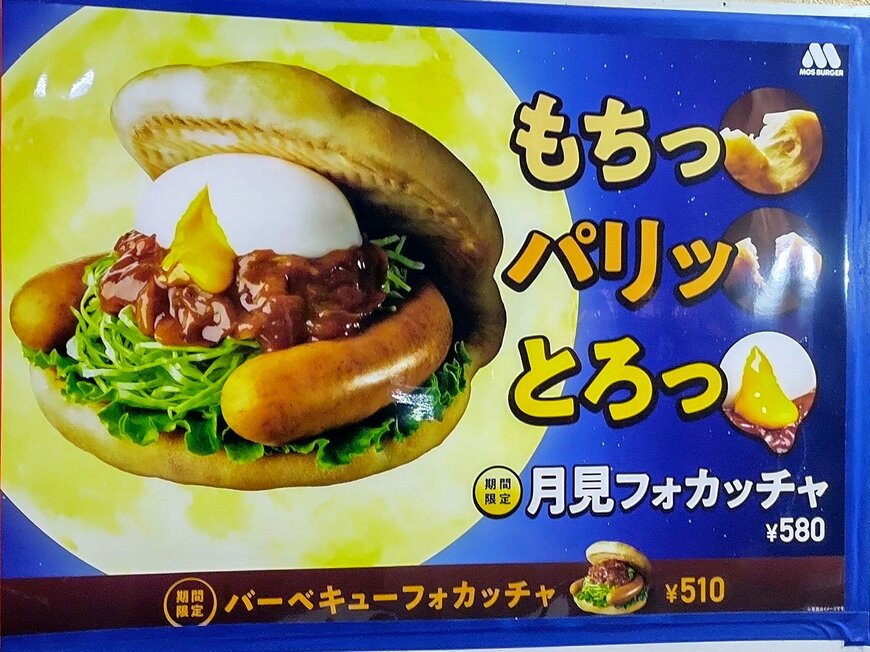 各外食チェーン店がこの時期に競って販売している月見系商品。中でもモスバーガーの月見フォカッチャはボリュームもしっかりあるとのこと。バンズではなくフォカッチャを使用しているのもポイントの1品です。