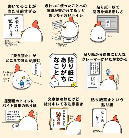 「@debu_dori」さんがまとめた、「貼り紙にありがちなこと」というテーマのイラストには、日常生活の中でよく見かける貼り紙が描かれていました。「当たり前のことが書いてある」「貼り紙で閉店を知る」など、思い返せば「見たことあるある!」というものばかり。