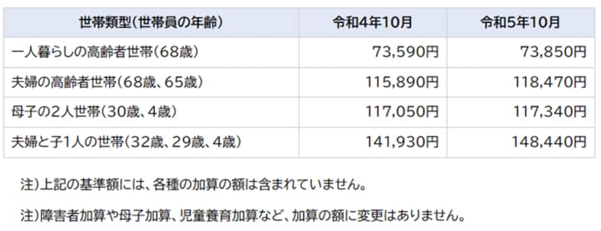 上記表によれば、一人暮らしの高齢者世帯では、見直し前と後では、約0.3%増の7万3850円、高齢夫婦世帯の場合は、約2.2%の11万8470円です。