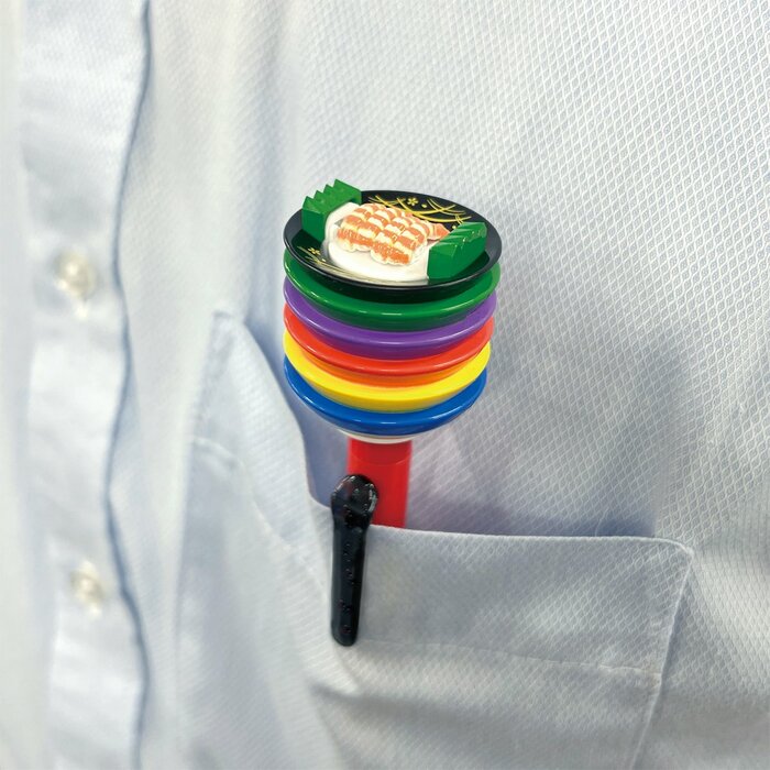 「寿司ペン」は、インパクトあるデザインのアイテムです。写真のように、シャツなどのポケットに差し込んでおけば、ユニークなアクセサリーにもなってくれます。