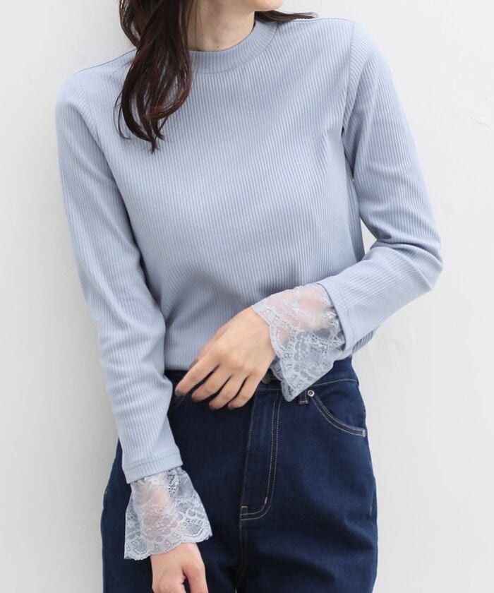 袖口の繊細なレースがおしゃれなカットソーです。程よい高さのプチハイネックと縦目のラインが上品な雰囲気を演出してくれます。