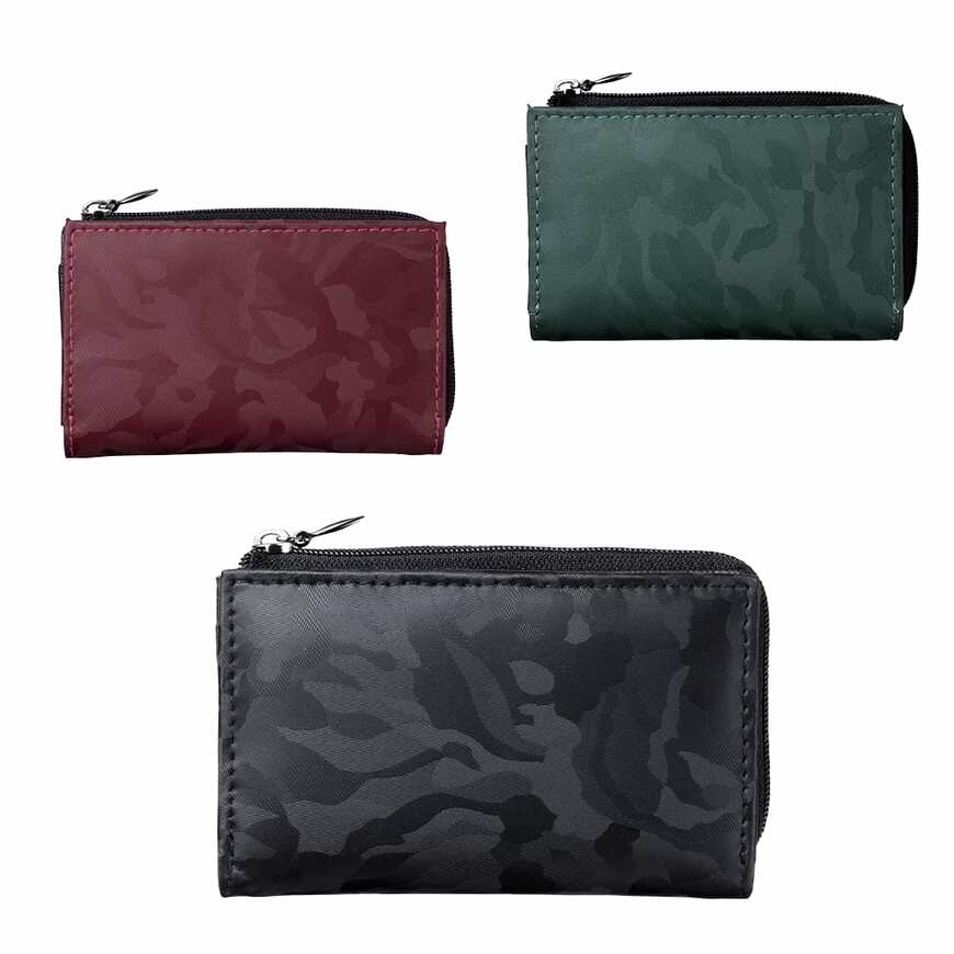 透かし迷彩柄がポイントの小銭入れ。L型のファスナーなので、小銭の出し入れがスムーズにできます。内側には、4枚収納できるカードポケット付き。