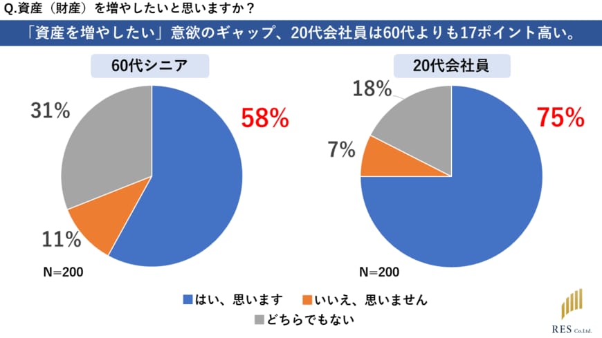 同調査では、「資産(財産)を増やしたいと思いますか?」という問いに、60代シニアの58%が「はい」と回答。20代会社員ではそれを17ポイント上回る75%が「資産を増やしたい」と答えています。