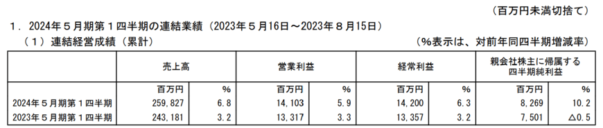 株式会社ツルハホールディングス(3391)(以下「同社」という)が、2024年5月期第1四半期連結決算(対象期間:2023年5月16日~2023年8月15日)を発表した。