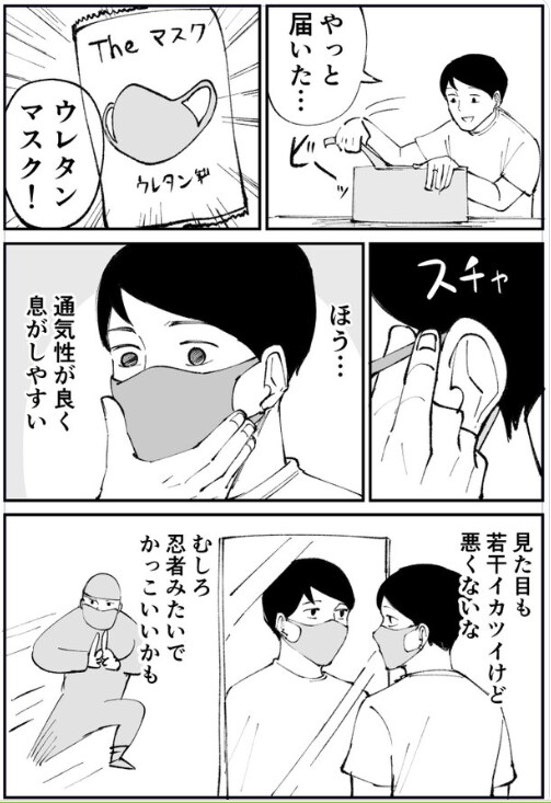コロナ禍の最中、「@aobonro」さんはウレタン製のマスクを購入していました。すっきりしたシルエットと呼吸のしやすさから「忍者みたいでかっこいいかも」と評価は上々な様子です。