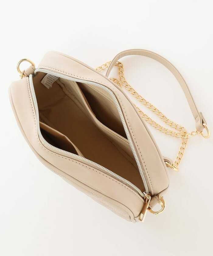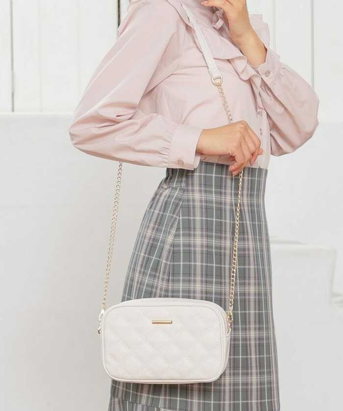 プレートとショルダー部分のチェーンがゴールドのアクセントになっています。表面はダイヤ型のステッチが施されており、持って出かけると気分が上がりそうですね。