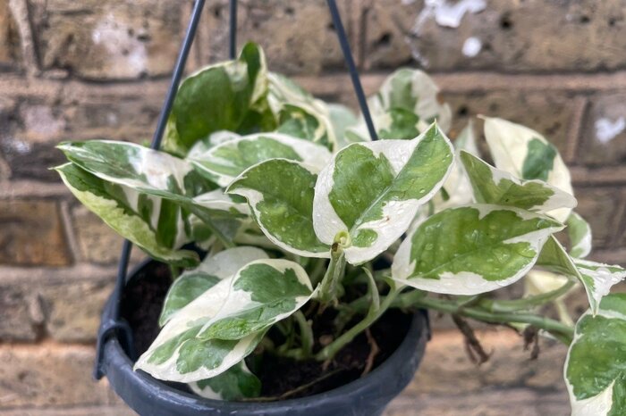 「ポトス・エンジョイ」は斑の入った葉がオシャレな品種です。鉢植えだけでなく、ハンギングにして飾るのもおすすめです。※参考価格:800円前後(3号ポット苗)