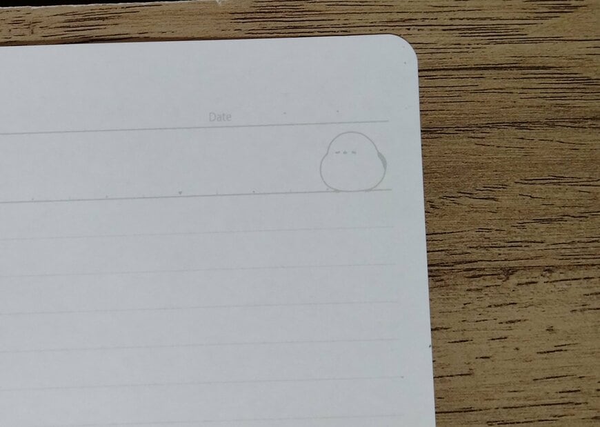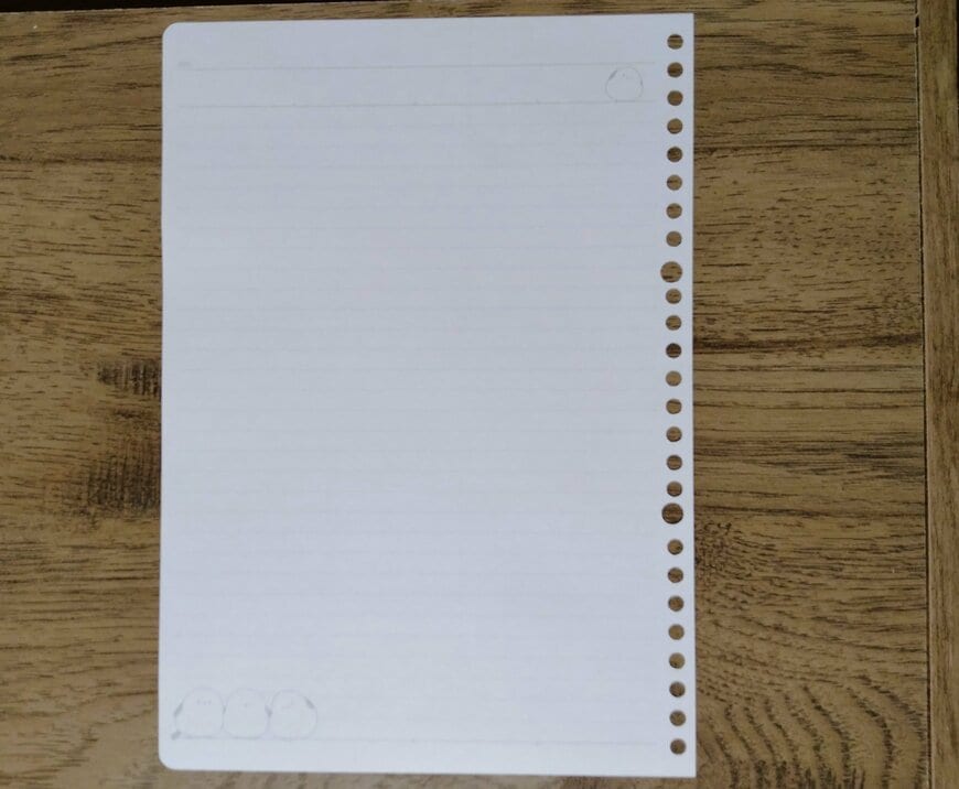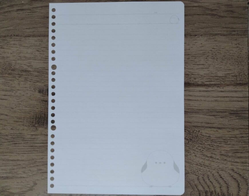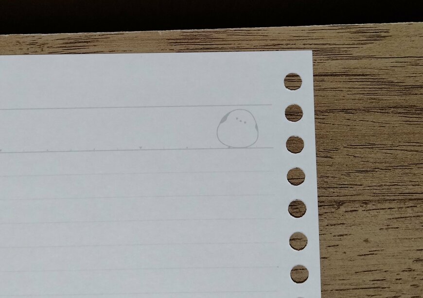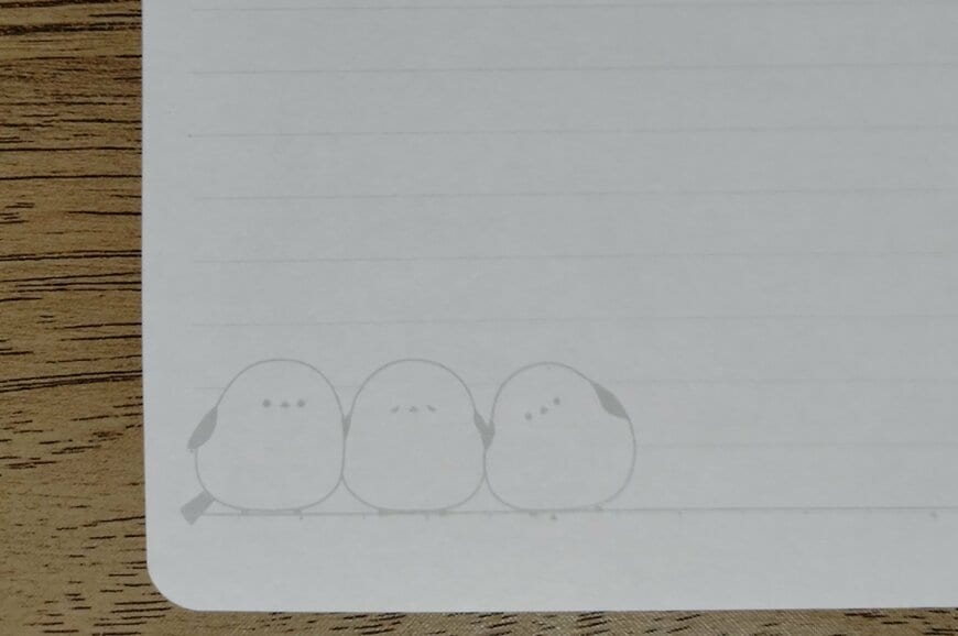 一番上の罫線の右端には首を傾げているシマエナガがデザインされています。合計6羽のシマエナガがかわいらしいルーズリーフです。