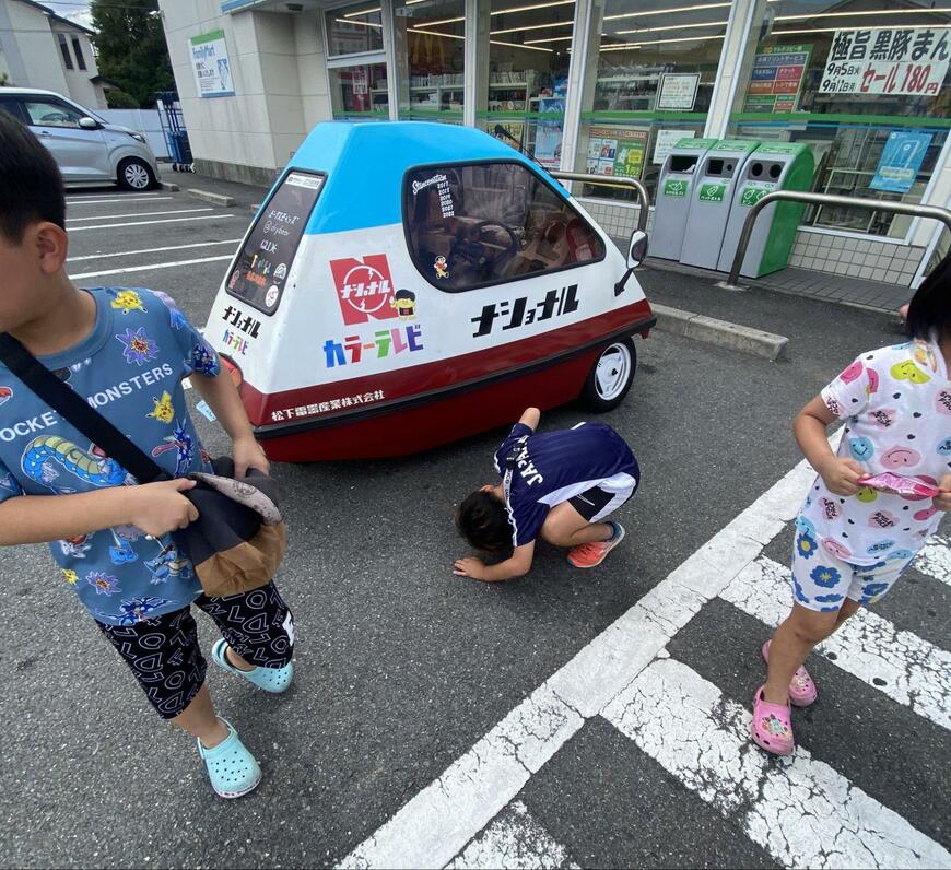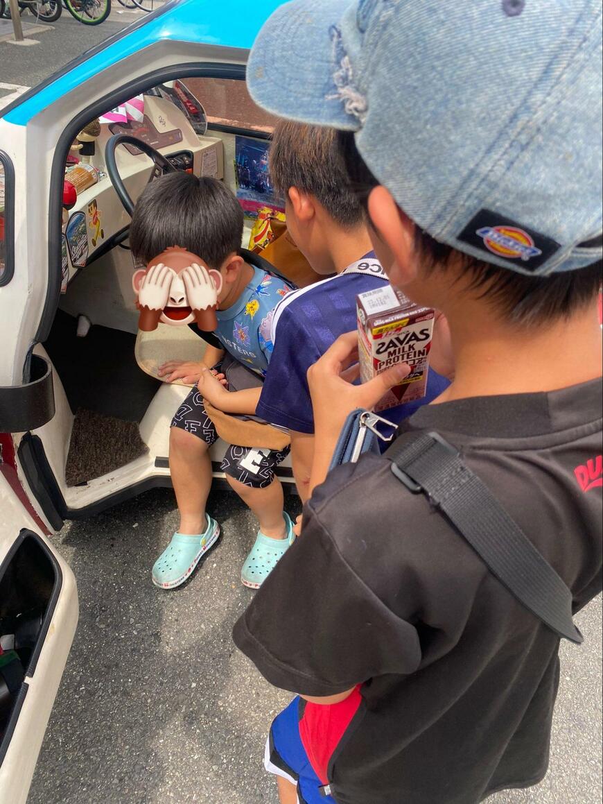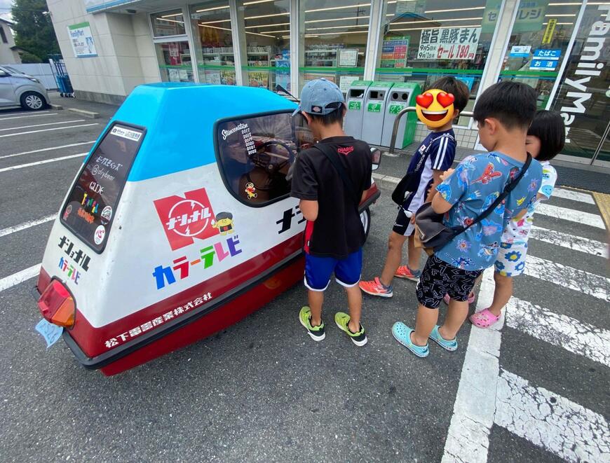 写っているのは、コンビニエンスストアの駐車場に停まる1台の車と、それを珍しそうに眺める子供達の姿です。