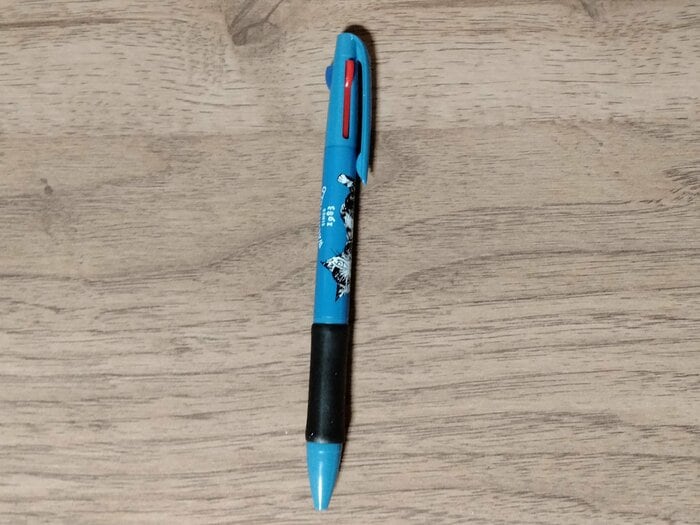 こちらの写真は、猫のダヤンデザインの3色ボールペンです。ブルーの軸とブラックのグリップがおしゃれなアイテムです。