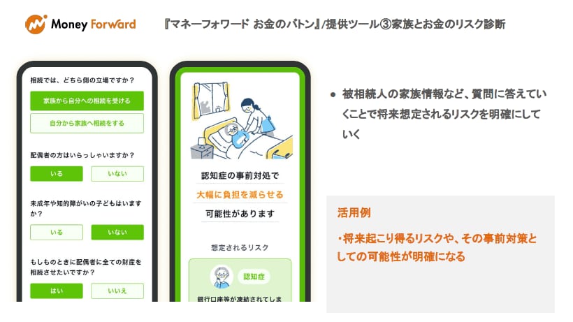 最後に「家族とお金のリスク診断」は、相続に関する潜在的なリスクを簡単に確認できるツールです。診断結果では想定されるリスクだけでなく、それを回避するためにやるべきことの一覧が自動で作成され、最初に紹介した「やることリスト」に追加されます。またLINEで家族と手軽に共有することもできます。