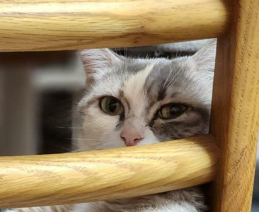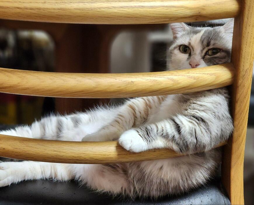そこに写っているのは、椅子の背もたれ部分に座る1匹の猫ちゃん。「メロン」ちゃんという女の子です。