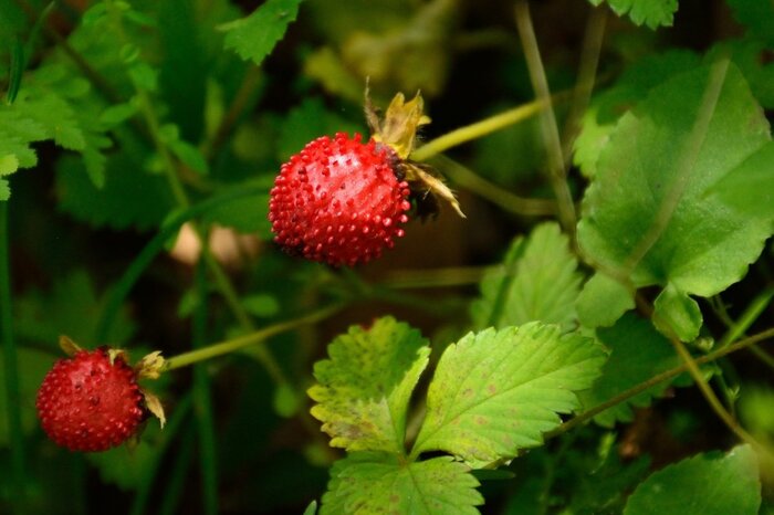 春に黄色い花が咲いたあと、小さな赤い実がなるヘビイチゴ。実に甘味はほとんどなく、やや湿った場所で地面をほふくするように広がります。