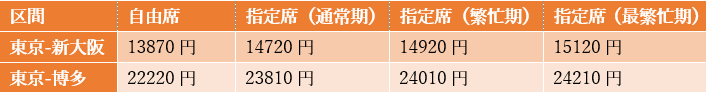 通常期の自由席と指定席の料金差は、東京~新大阪間が850円、東京~博多間が1590円です。お土産をもう1個増やしたり、コンコース内のレストランで1人分の食事をするくらいの金額の違いがあります。