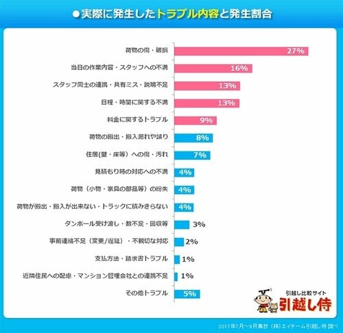 また、エイチームのグループ会社であるエイチーム引越し侍はこのほど、運営する引越し比較サイト「引越し侍」の利用者へ実施したアンケート結果を元にした「引越しのトラブル」に関する調査結果を公開しました。実際に起こったトラブルとはどのようなものなのでしょうか。
