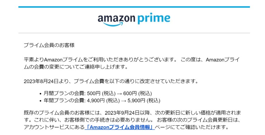 Amazonプライム会員は、2023年8月にプライム会費が以下のとおり値上げされた。