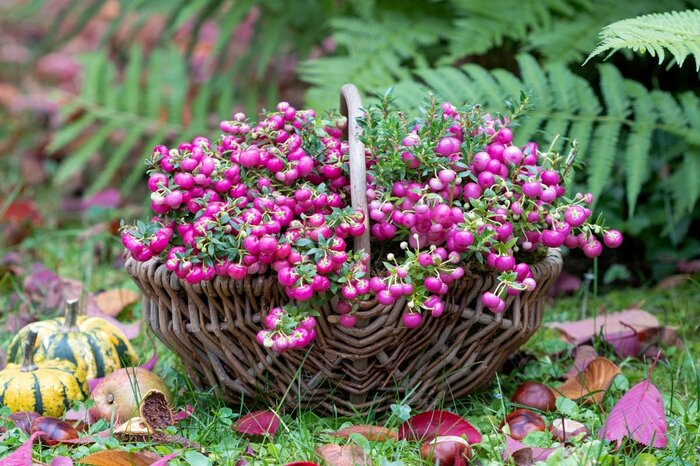 丸い実のなるペルネッティアやチェッカーベリーなどは、赤やピンクの実が寄せ植えのアクセントになります。