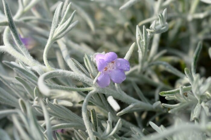 エレモフィラ・ニベアは、シルバーの葉とパープルの花が美しい常緑多年草(あるいは低木)です。高温多湿に弱いため、一緒に植える植物には注意しましょう。