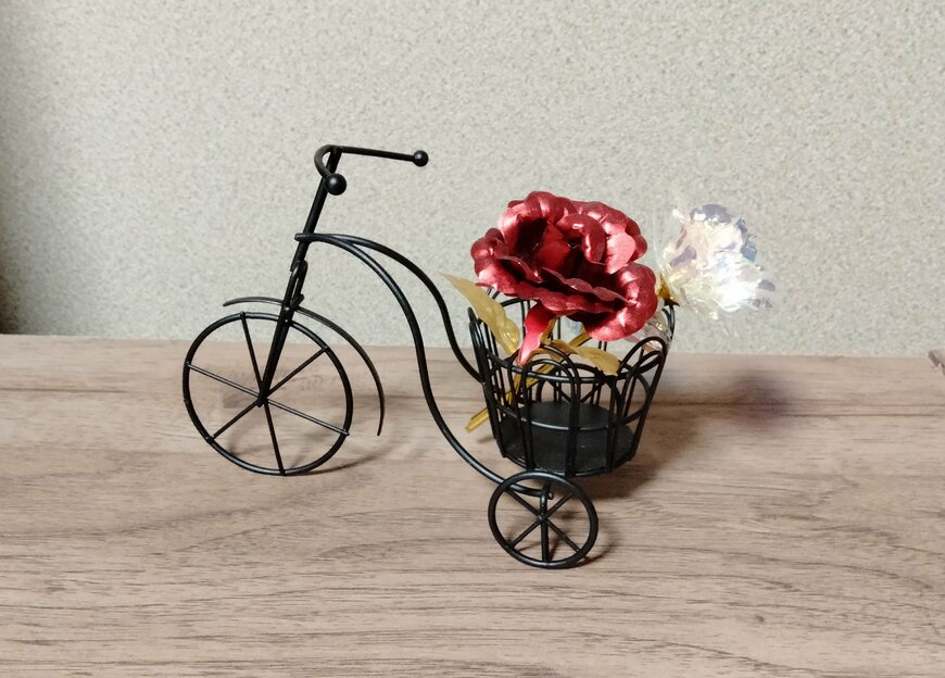 ダイソーで、写真のようなおしゃれなアイアンインテリア小物を発見しました。レトロかわいい自転車の置物です。