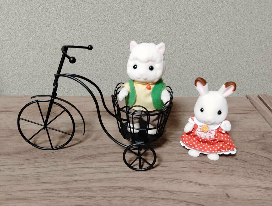 こちらの自転車には、写真のようにシルバニアを乗せることも可能です。シルバニアファミリーのお父さんやお母さんサイズの人形も乗せられます。