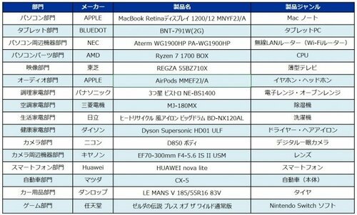 調理家電部門ではパナソニックのオーブンレンジ「3つ星 ビストロ NE-BS1400」、自動車部門ではマツダの「CX-5」が大賞を受賞。また、今年大ヒットとなった任天堂「Nintendo Switch」のソフト(ゼルダの伝説 ブレス オブ ザ ワイルド 通常版)など、新たなヒット製品や「完全ワイヤレスイヤホン」という新ジャンルを開拓したアップル「AirPods」など、新たな潮流を象徴する製品も選出される結果となっている。
