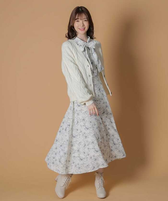 カーデやベスト、ニットなどを重ねてボウタイを出して着こなしても素敵です。ロングシーズン活躍してくれそうなワンピースです。