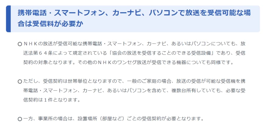 これらの機器がNHK放送を受信できる場合、「協会の放送を受信できる受信設備」とみなされ、NHK受信料を支払う必要があると放送法に規定されています。