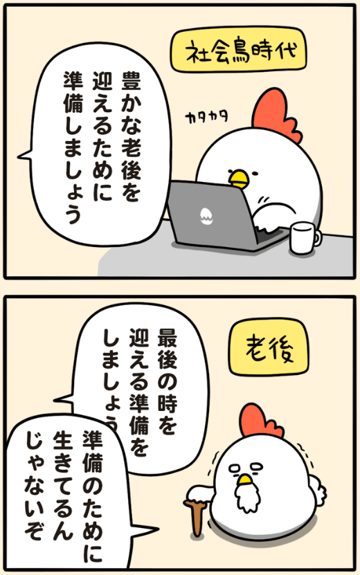 そして月日は流れ、ニワトリは会社に就職します。それでも、最後まで「将来の準備」と言われ続けるのでした。ニワトリの「準備のために生きてるんじゃねえぞ」という言葉には、思わずハッと考えさせられます…。