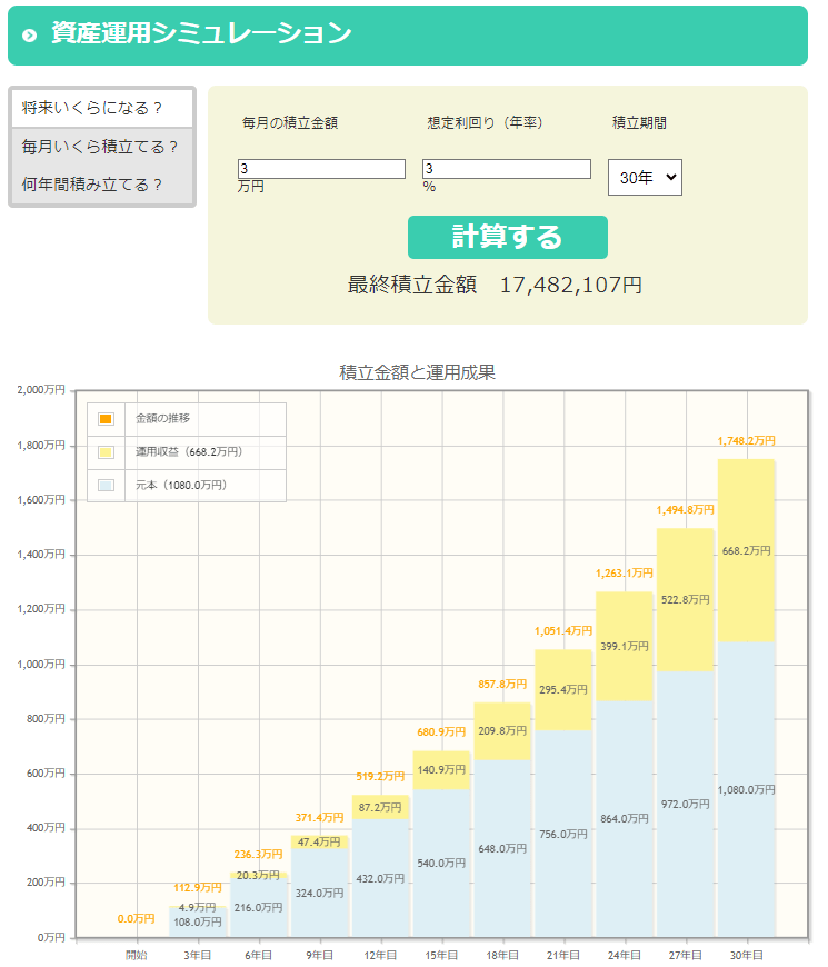 たとえば、月3万円の積立投資を運用利回り年率3%で30年間続ければ、約1748万円の資産を築けます。