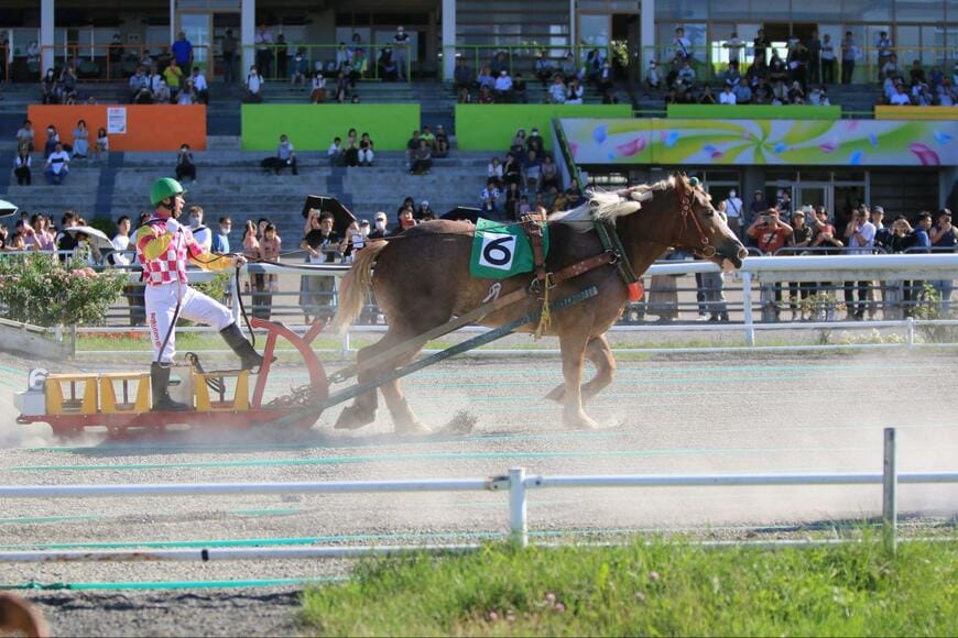 帯広競馬場で実施されている競馬は、世界で唯一となる競走馬がそりを引きながら速さを競うばんえい競馬。2箇所の障害が設置された直線200mのセパレートコースで行われます。