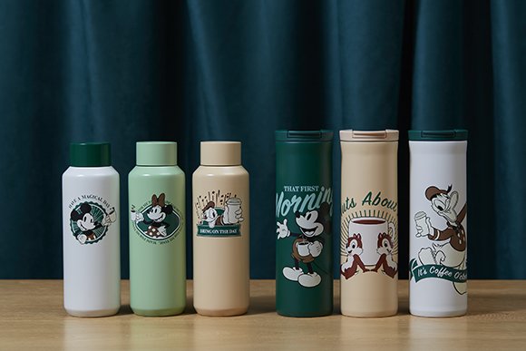 商品は毎日使いたくなるステンレスボトルがラインナップ。2種のボトルには、このコレクションのために描かれたミッキーやミニーたちが、ノスタルジックなトーンで表現されています。「コーヒーのお時間だ!」、「マジカルな一日を!」など、思わず笑顔がこぼれるディズニーキャラクターからのメッセージもチェックしてみてくださいね。