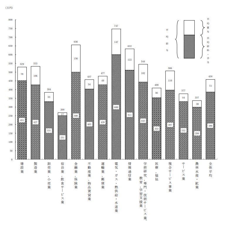 最も高い順に「電気、ガス、熱供給」(747万円)「金融業、保険業」(656万円)「情報通信業」(632万円)となっています。