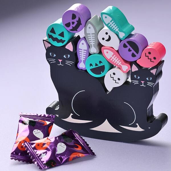 黒猫とハロウィンモチーフがかわいい木製パズルです。パーツを詰み上げていくバランスゲーム。グレープ風味のキャンディと共に楽しんでくださいね。