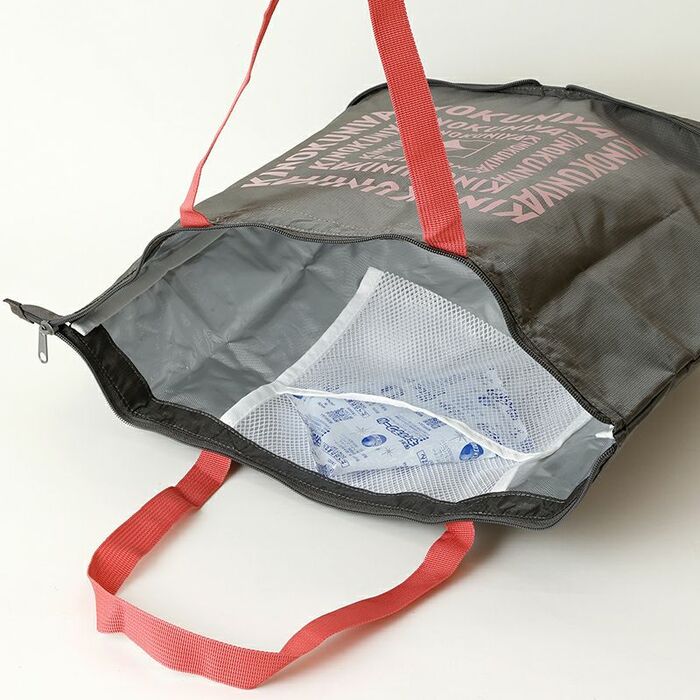 保冷バッグなのに折畳ができる便利なエコバッグ。ファスナーで密閉できるほか、保冷剤を入れるポケットも付いているので、バッグ内を冷たく保ちやすくなっています。