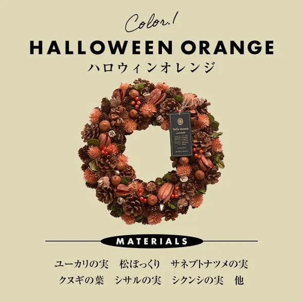 松ぼっくりや様々な木の実をふんだんに使用したリース。ビビッドなオレンジが効いたデザインによってパッとお部屋を明るくし、ハロウィンムードをさらに引き立てます。ハロウィンの飾り付けをしたけど何か足りない……?と思った時におすすめのアイテムです。ちなみに、こちらのハロウィンオレンジは好評につき2023年9月20日時点で既に完売している状況です。