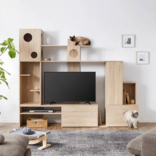 まるでアスレチックのような要素をたっぷり備え、多頭飼いのお家でも使いやすい、猫たちが大興奮して遊べるキャットウォーク付きテレビ台です。迷路のように入り組み、高低差のあるテレビ台は、遊び心満載で猫の好奇心をくすぐります。