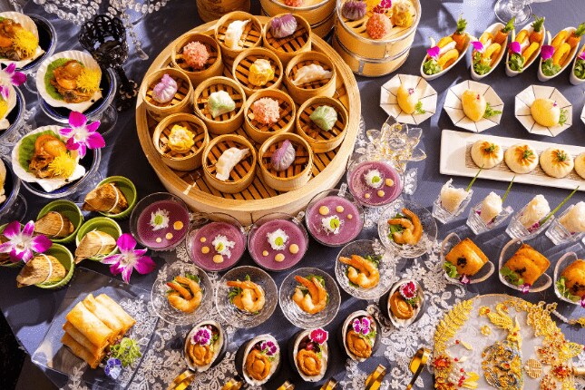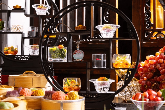 東京の一流ホテルであるヒルトン東京では、王妃のお茶会をイメージしたチャイニーズアフタヌーンティー「シノワ・レーヌ」を開催しています。中秋の名月を祝う宴の前に、王妃が後宮で密かに楽しむ秋のお茶会をイメージした料理が並び、その様子はまさに豪華絢爛。