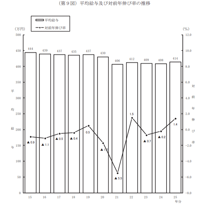 以前、平均年収が400万円台後半だったのは平成13(2001)年の454万円でした。実に21年ぶりに年収450万円を超えることができました。