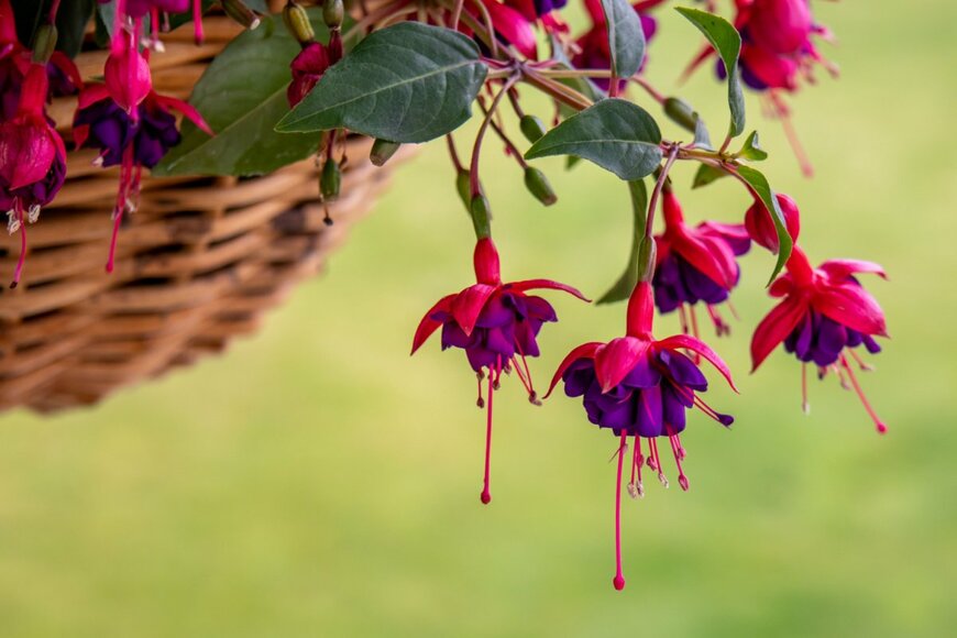 ドレスのようなエレガントな花が魅力のフクシア。上品な花姿から「貴婦人のイヤリング」とも称されています。