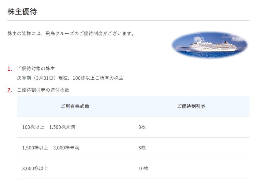 日本郵船は決算期(2023年3月期)現在、100株以上保有する方に向けて優待割引券を3枚提供しています(配布枚数は株数により異なる)。