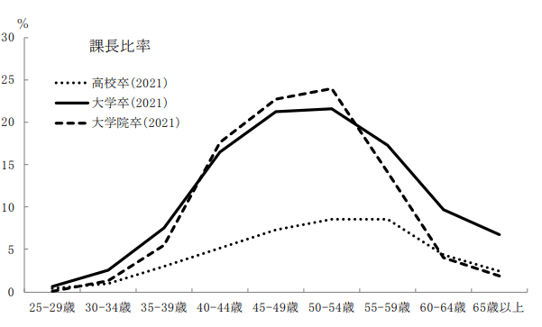 50~54歳が、課長の割合がもっとも高くなっています。大学院卒では、約4人に1人が課長です。
