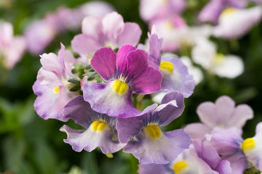 美しい花の形もさることながら、さまざまな色合いも楽しめるネメシア。定番のピンクやホワイトだけでなく、深みのあるレッドやパープル、ダークブルーなど、大人っぽい花色も出回っています。