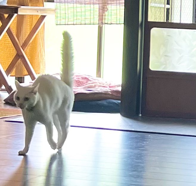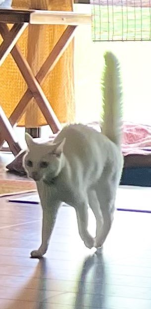 SNSで注目を浴びているのは、白猫の男の子「ソウ」くん。しっぽをこれでもかと逆立てて、走ってくる姿が注目されています。