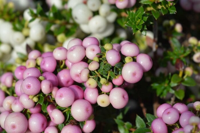 ペルネチアは秋に丸い実を付ける常緑低木。白い実がたわわになるので「真珠の木」と呼ばれ、ほかにピンクや赤の実がなるものもあります。