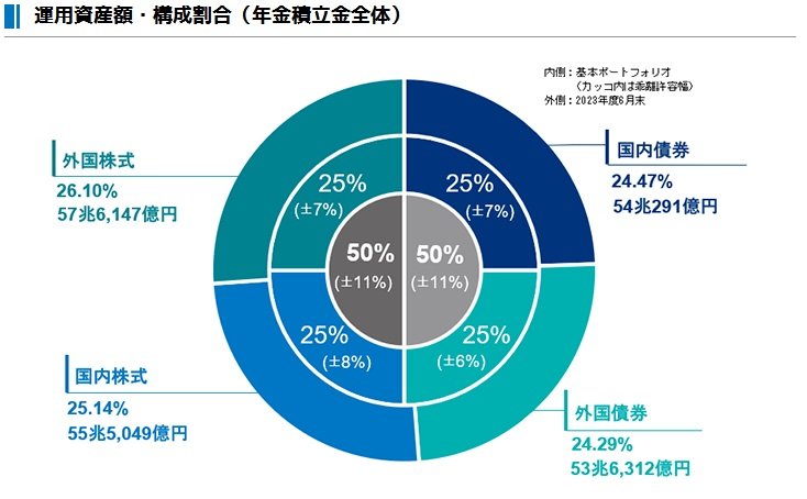一例を紹介すると、国民年金を運用するGPIF(年金積立金管理運用独立行政法人)では以下のようなポートフォリオを組んでいます。