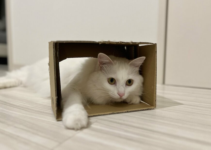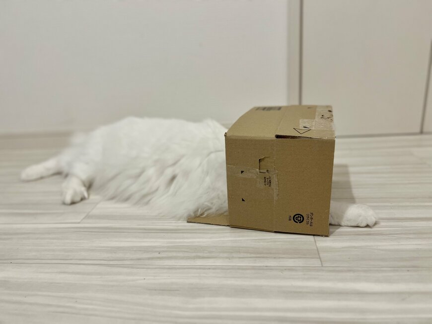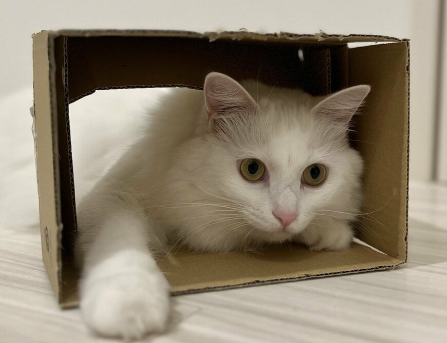 猫は箱に入るのが好きですよね。そう、この白猫のマオちゃんも同じです。